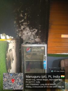 భద్రాద్రి కొత్తగూడెం జిల్లా మణుగూరు మండలం అశోక్ నగర్ తెలుగుదేశం సెంటర్ లో గ్రిల్ నైట్స్ రెస్టారెంట్ ఫిబ్రవరి 27 అర్ధరాత్రి మంటలు రావడంతో, సమీపంలో ఉన్న హెచ్ డి ఎఫ్ సి బ్యాంక్ సెక్యూరిటీ గార్డ్ అప్రమత్తమై లోపల ఉన్న వర్కర్లను లేపడంతో వర్కర్ల ప్రాణాలు రక్షించడం జరిగిందని విశ్వసనీయ సమాచారం అర్ధరాత్రి ఫైర్ స్టేషన్ కు సమాచారం ఇవ్వడం ,ఫైర్ సిబ్బంది అక్కడికి చేరుకునే సమయానికల్లా,చుట్టుపక్కల వాళ్ళు నీళ్లతో మంటలను అదుపు చేసినట్లు సమాచారం రెస్టారెంట్ నడుపుతున్న యజమానికి, సుమారు 7 లక్షల వరకు నష్టం జరిగిందని రెస్టారెంట్ నిర్వాహకుడు వాపోయాడు సంఘటన స్థలానికి చేరుకున్న ఫైర్ సిబ్బంది, ఎలక్ట్రిసిటీ సిబ్బంది రెస్టారెంట్ ను నిశితంగా పరిశీలించి, ఫైర్ సేఫ్టీ లేకపోయినా షార్ట్ సర్క్యూట్ అయినా రెస్టారెంట్ పూర్తిగా 100% కాలిపోయేదని తెలుపుతున్నారు పెప్సీ ఫ్రిడ్జ్ కంప్రెసర్ వల్ల ఈ సంఘటన జరిగి ఉండవచ్చని , లేదా షార్ట్ సర్క్యూట్ వల్ల జరిగి ఉండవచ్చునని స్థానికులు అనుకుంటున్నారు ఏది ఏమైనా , దేనివల్ల ఈ సంఘటన జరిగిన,అద్దె పద్ధతిన రెస్టారెంట్ నడుపుతున్న వారికి సుమారు 7 లక్షల ఆస్తి నష్టం జరిగి ఉందని రెస్టారెంట్ నిర్వాహకులు ,స్థానికులు అనుకుంటున్నారు సంబదిత అధికారులు నష్టపోయిన రెస్టారెంట్ నడుపుతున్న వారిని ,ఆదుకోవాలని స్థానికులు, నిర్వాహకులు వాపోతున్నారు ఈ సంఘటనపై స్థానిక పోలీస్ డిపార్ట్మెంట్, ఫైర్ డిపార్ట్మెంట్, ఎలక్ట్రిసిటీ డిపార్ట్మెంట్, అధికారులు ,దేని లోపం వల్ల ఈ సంఘటన జరిగిందో ? తేల్చాల్సిన అవసరం ఎంతో ఉంది రెస్టారెంట్ నిర్వాహకుల ఆస్తి నష్టాన్ని అంచనావేసి సంబంధిత అధికారులు ఆదుకోవాలని నిర్వాహకులు స్థానికులు ఆవేదన వ్యక్తం చేస్తున్నారు