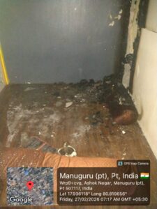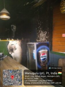 భద్రాద్రి కొత్తగూడెం జిల్లా మణుగూరు మండలం అశోక్ నగర్ తెలుగుదేశం సెంటర్ లో గ్రిల్ నైట్స్ రెస్టారెంట్ ఫిబ్రవరి 27 అర్ధరాత్రి మంటలు రావడంతో, సమీపంలో ఉన్న హెచ్ డి ఎఫ్ సి బ్యాంక్ సెక్యూరిటీ గార్డ్ అప్రమత్తమై లోపల ఉన్న వర్కర్లను లేపడంతో వర్కర్ల ప్రాణాలు రక్షించడం జరిగిందని విశ్వసనీయ సమాచారం అర్ధరాత్రి ఫైర్ స్టేషన్ కు సమాచారం ఇవ్వడం ,ఫైర్ సిబ్బంది అక్కడికి చేరుకునే సమయానికల్లా,చుట్టుపక్కల వాళ్ళు నీళ్లతో మంటలను అదుపు చేసినట్లు సమాచారం రెస్టారెంట్ నడుపుతున్న యజమానికి, సుమారు 7 లక్షల వరకు నష్టం జరిగిందని రెస్టారెంట్ నిర్వాహకుడు వాపోయాడు సంఘటన స్థలానికి చేరుకున్న ఫైర్ సిబ్బంది, ఎలక్ట్రిసిటీ సిబ్బంది రెస్టారెంట్ ను నిశితంగా పరిశీలించి, ఫైర్ సేఫ్టీ లేకపోయినా షార్ట్ సర్క్యూట్ అయినా రెస్టారెంట్ పూర్తిగా 100% కాలిపోయేదని తెలుపుతున్నారు పెప్సీ ఫ్రిడ్జ్ కంప్రెసర్ వల్ల ఈ సంఘటన జరిగి ఉండవచ్చని , లేదా షార్ట్ సర్క్యూట్ వల్ల జరిగి ఉండవచ్చునని స్థానికులు అనుకుంటున్నారు ఏది ఏమైనా , దేనివల్ల ఈ సంఘటన జరిగిన,అద్దె పద్ధతిన రెస్టారెంట్ నడుపుతున్న వారికి సుమారు 7 లక్షల ఆస్తి నష్టం జరిగి ఉందని రెస్టారెంట్ నిర్వాహకులు ,స్థానికులు అనుకుంటున్నారు సంబదిత అధికారులు నష్టపోయిన రెస్టారెంట్ నడుపుతున్న వారిని ,ఆదుకోవాలని స్థానికులు, నిర్వాహకులు వాపోతున్నారు ఈ సంఘటనపై స్థానిక పోలీస్ డిపార్ట్మెంట్, ఫైర్ డిపార్ట్మెంట్, ఎలక్ట్రిసిటీ డిపార్ట్మెంట్, అధికారులు ,దేని లోపం వల్ల ఈ సంఘటన జరిగిందో ? తేల్చాల్సిన అవసరం ఎంతో ఉంది రెస్టారెంట్ నిర్వాహకుల ఆస్తి నష్టాన్ని అంచనావేసి సంబంధిత అధికారులు ఆదుకోవాలని నిర్వాహకులు స్థానికులు ఆవేదన వ్యక్తం చేస్తున్నారు