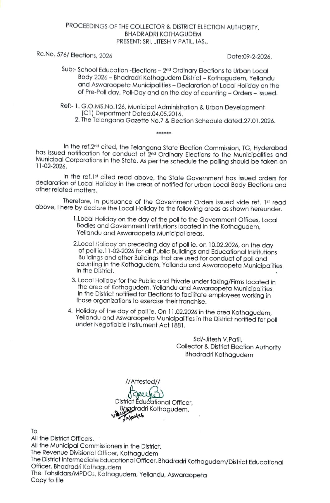 LATEST NEWS చర్చ : భద్రాద్రి కొత్తగూడెం జిల్లా , మునిసిపల్ ఎన్నికల దృశ్య 11వ తేదీన సెలవు ప్రకటించిన భద్రాద్రి కొత్తగూడెం జిల్లా కలెక్టర్… By Neti Charcha Last updated Feb 10, 2026 94 చర్చ , భద్రాద్రి కొత్తగూడెం జిల్లా ఫిబ్రవరి 11న తెలంగాణ రాష్ట్రంలో జరగబోయే మునిసిపల్ ఎన్నికలకు భద్రాద్రి కొత్తగూడెం జిల్లా కలెక్టర్ 11వ తారీఖున సెలవు ప్రకటించడం జరిగింది. ఓటర్లందరూ తమ ఓటు హక్కును వినియోగించుకోవాలని కలెక్టర్ గారు దూషించడం జరిగింది.